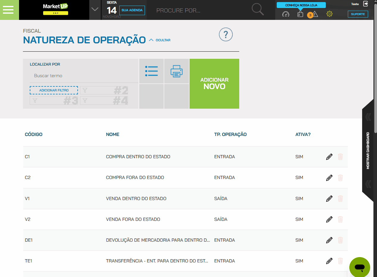 No MarketUP, você encontra todos os CFOPs liberados para uso visitando CONFIGURAÇÕES > FISCAL > NATUREZA DE OPERAÇÃO.