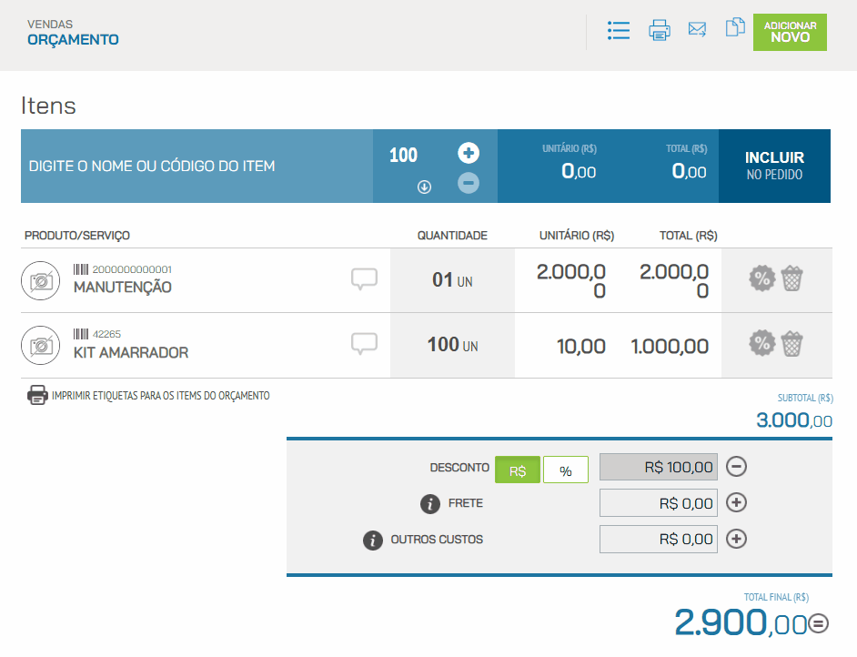 Sim, ao clicar em ADICIONAR NOVO, você pode criar um orçamento e aplicar o desconto: