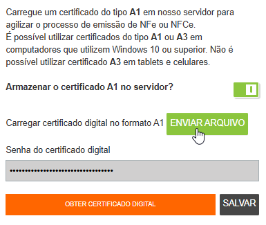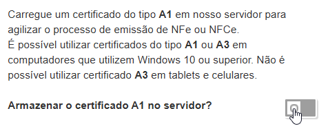 Nessa nova página, habilite o campo ARMAZENAR O CERTIFICADO A1 NO SERVIDOR?, alterando de CINZA para VERDE.