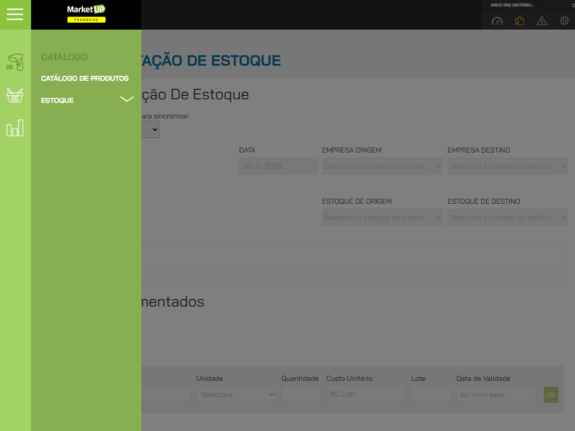 Ao acessar o Franquias/MultiLoja, entre em CATÁLOGO > ESTOQUE > MOVIMENTAÇÃO DE ESTOQUE: