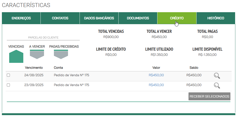 No cadastro do cliente, na aba CRÉDITO, você pode ver o histórico financeiro: contas pagas, atrasadas, recebimentos futuros, crédito usado e disponível para venda.